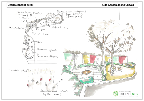 For now plans are drawn up to revamp the front and side gardens, providing solutions for the multi height and difficult shape. This garden for the children will include areas for socialising, a sunken trampoline play area and lawn. Planting will be low maintenance with grasses and perennials and splashes of colour through gravelled borders. All defined by a low level box hedge which meanders its way through the length of the garden.