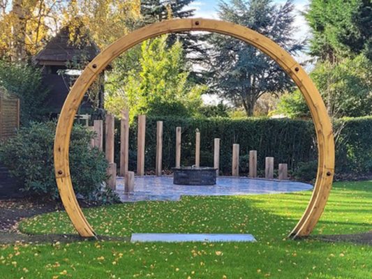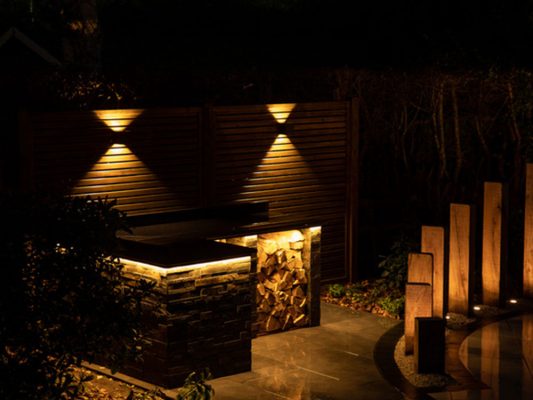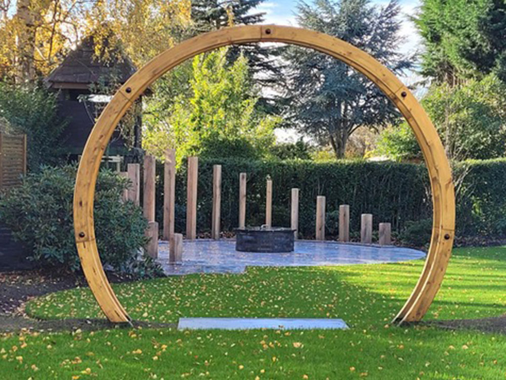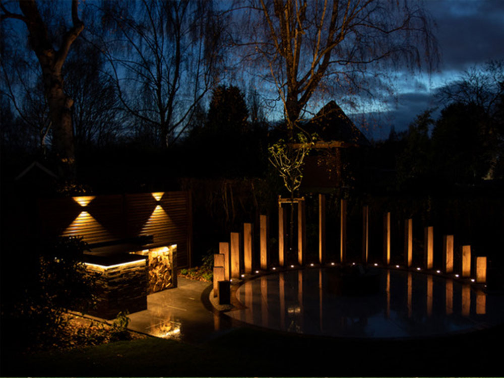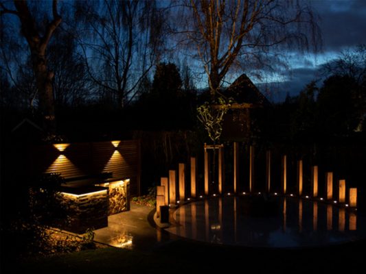 The vertical timber posts arc around the patio creating an intermittent screen and architectural interest, enhanced at night by a subtle lighting scheme.