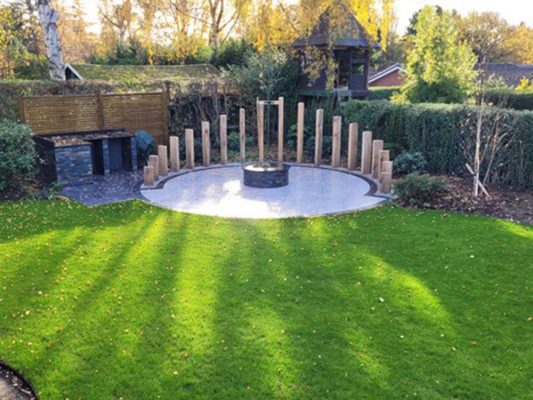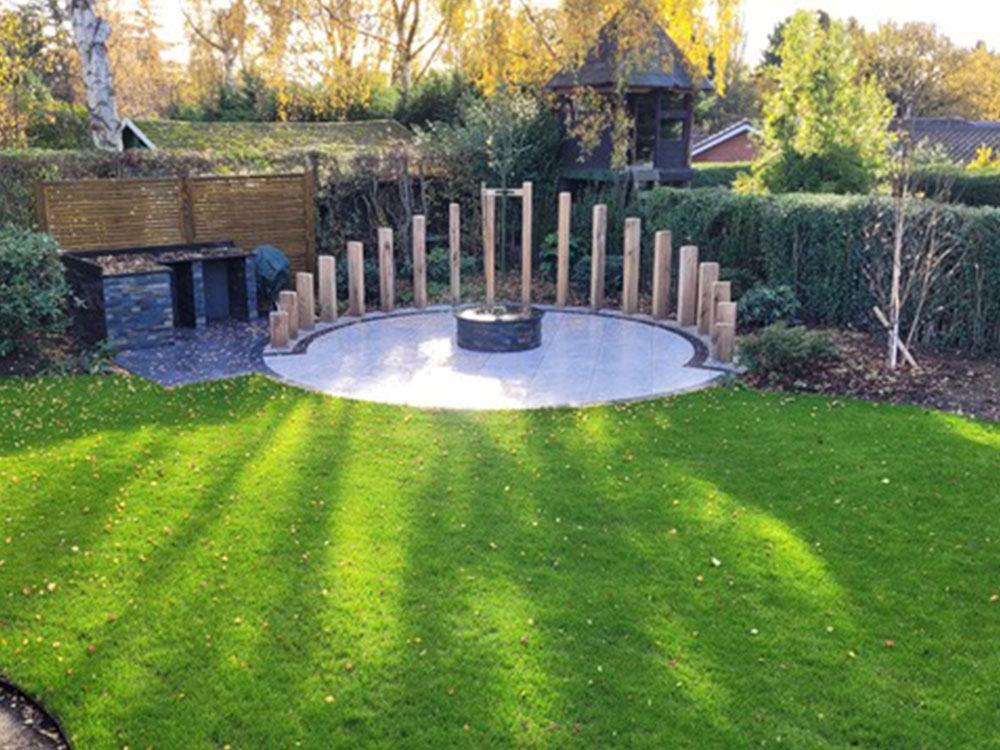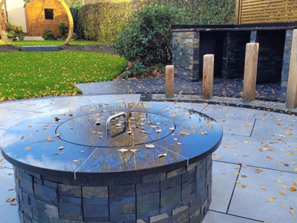 The garden was given a main focal point in the corner with the addition of a porcelain patio with a fire pit next to an outdoor kitchen area, great for summer barbeques and family get-togethers.
