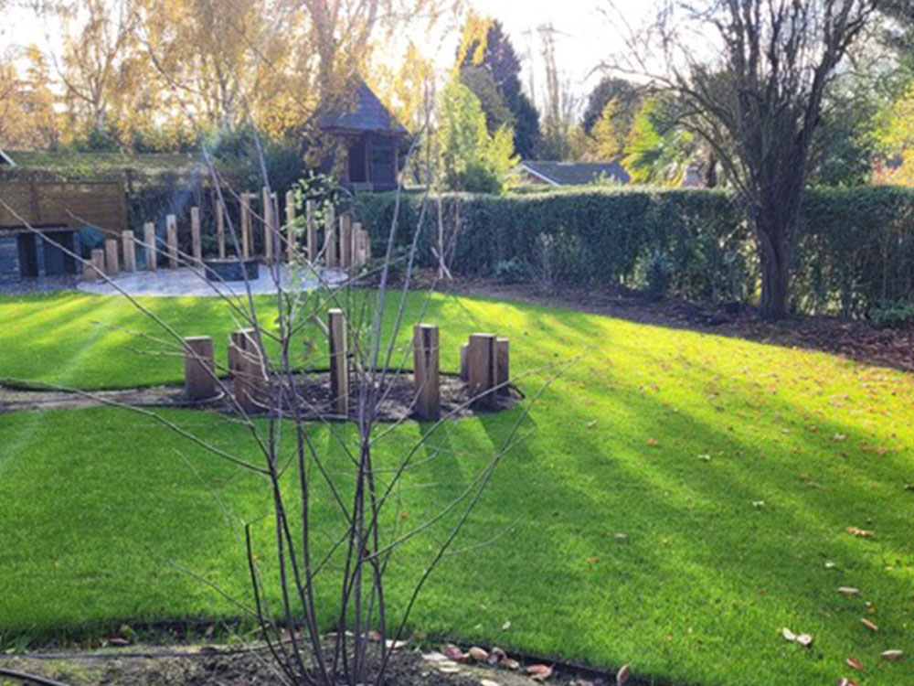 The lawns have been regraded, seeded and now shaped to sweep through the space, providing structure and enhancing the planting areas.
